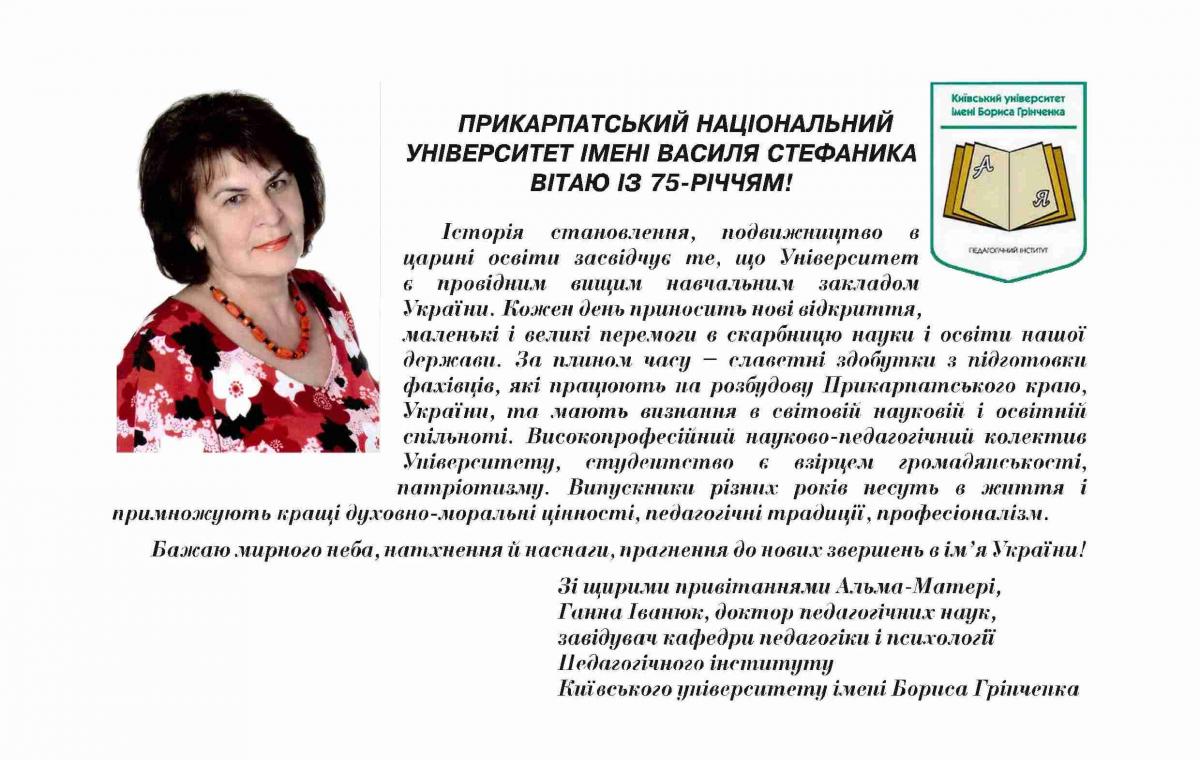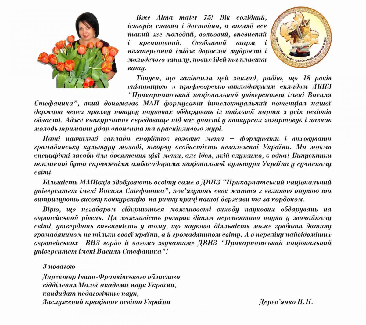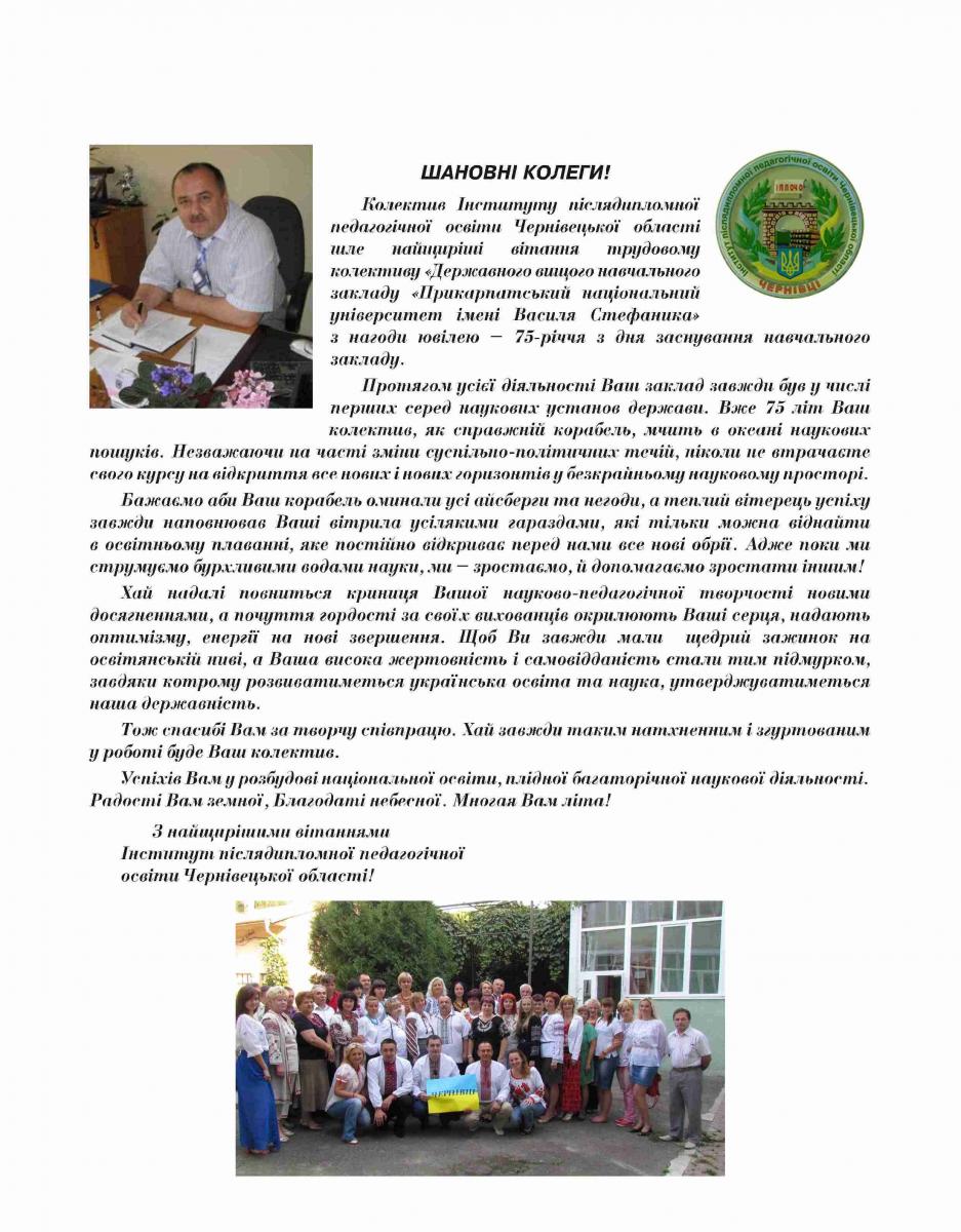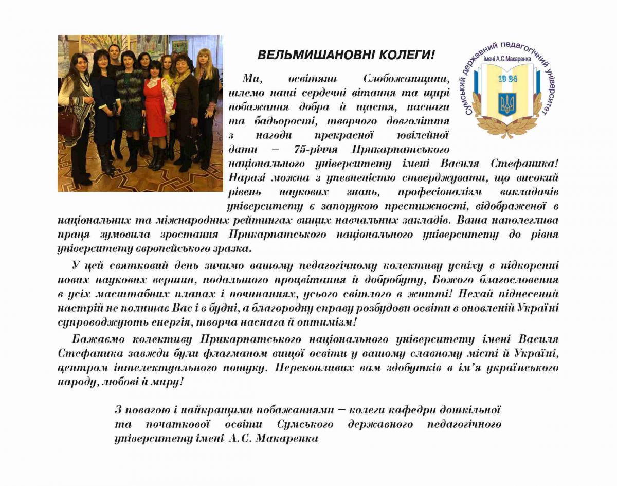 На адресу журналу «Гірська школа Українських Карпат» надійшли вітання з нагоди 75-річчя ДВНЗ «Прикарпатський національний університет імені Василя Стефаника»